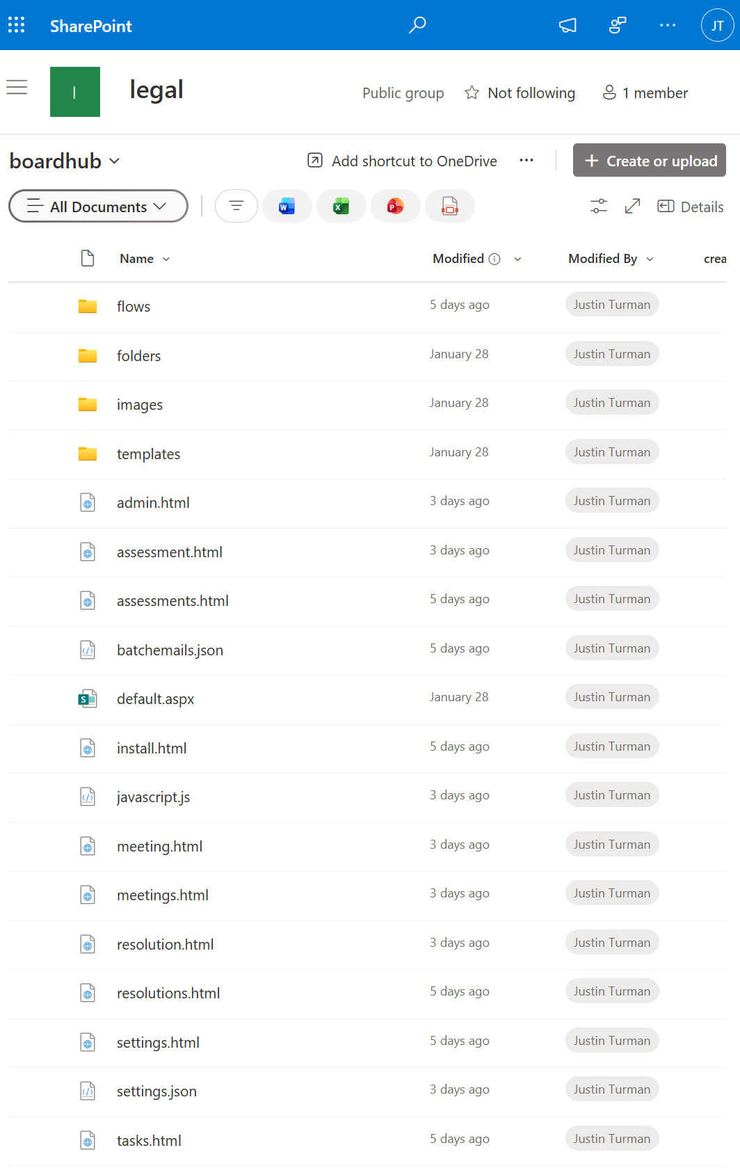 Next you need to create a document library. You must first have a SharePoint and you must have owner rights to the SharePoint. Go to your SharePoint. For example: /sites/legal. Go to the Site Contents and create a document library. For example: 'boardhub'. For On-Prem installation, go into your new document library and copy the contents of the board_hub_install.zip folder. You need everything except the aowgeneralapp.sppkg. When done it should look like this: